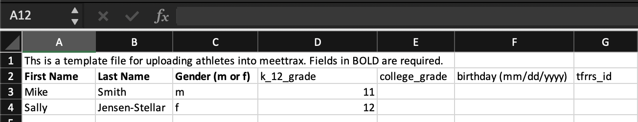 - Athlete data should start on line 3. Any data above line 3 will be ignored!